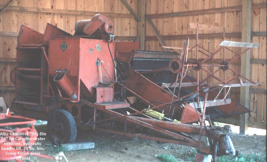 Our operational combine, Serial B-69872 , is a 1958 Series B with the 25 bushel grain bin (earlier combines had had an 18-bushel bin, or a bagging platform), a Scour Kleen grain cleaner above the bin, and an unloading auger emerging from the right side of the bin. This model is called the Big Bin 66 in Allis-Chalmers Farm Equipment 1914 - 1985 by Swinford. The photocopied manual I have is for the earlier version of the Series B , with the smaller grain bin (recognizable by the unloading auger on the front), and doesn't show the grain cleaner at all. I have given up on my manual distribution, as my copy is a second-generation photocopy and I wasn't satisfied with the results. As of 2006, a web search finds several sources of reproductions, notably Tom Yanowski's All Crop site and SSB Tractor.